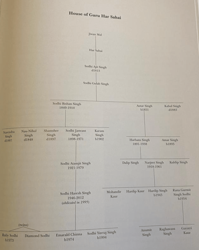 In the book The Punjab Chiefs, the chapter on the House of Guruharsahai begins the first two pages with the correct history of the Guruharsahai family, beginning with Jiwan Mal, who named my ancestral village after his eldest son Guru Har Sahai. But then the writer (Bobby Singh Bansal) somehow deviates from thereon. The writer seems to have taken it upon himself to draw an excessive family tree that gives prominence to an offshoot Sodhi family (Autar Singh) who’s related but is NOT the direct descendants of Guru Ram Das Sodhi, and whose family was never the Chiefs of Punjab from Guruharsahai. My father, Haresh Singh Sodhi, once noted that “Since the time of Jimal Mal who was 7th in descent from Guru Ram Das Ji all our ancestors have been living in Guruharsahai.” The writer ignores the closest relatives of the Guruharsahai family, who are the direct descendants of Guru Ram Das Sodhi and whose ancestors resided in Pothimala and Guruharsahai for centuries but handpicked the one name he chose to highlight in this book. To do this, Bansal (2020) arbitrarily deviated the family tree from Guru Har Sahai’s eldest grandson, known as Sodhi Gulab Singh, who had three sons (Sodhi Bishan Singh, Autar Singh, and Kabul Singh).